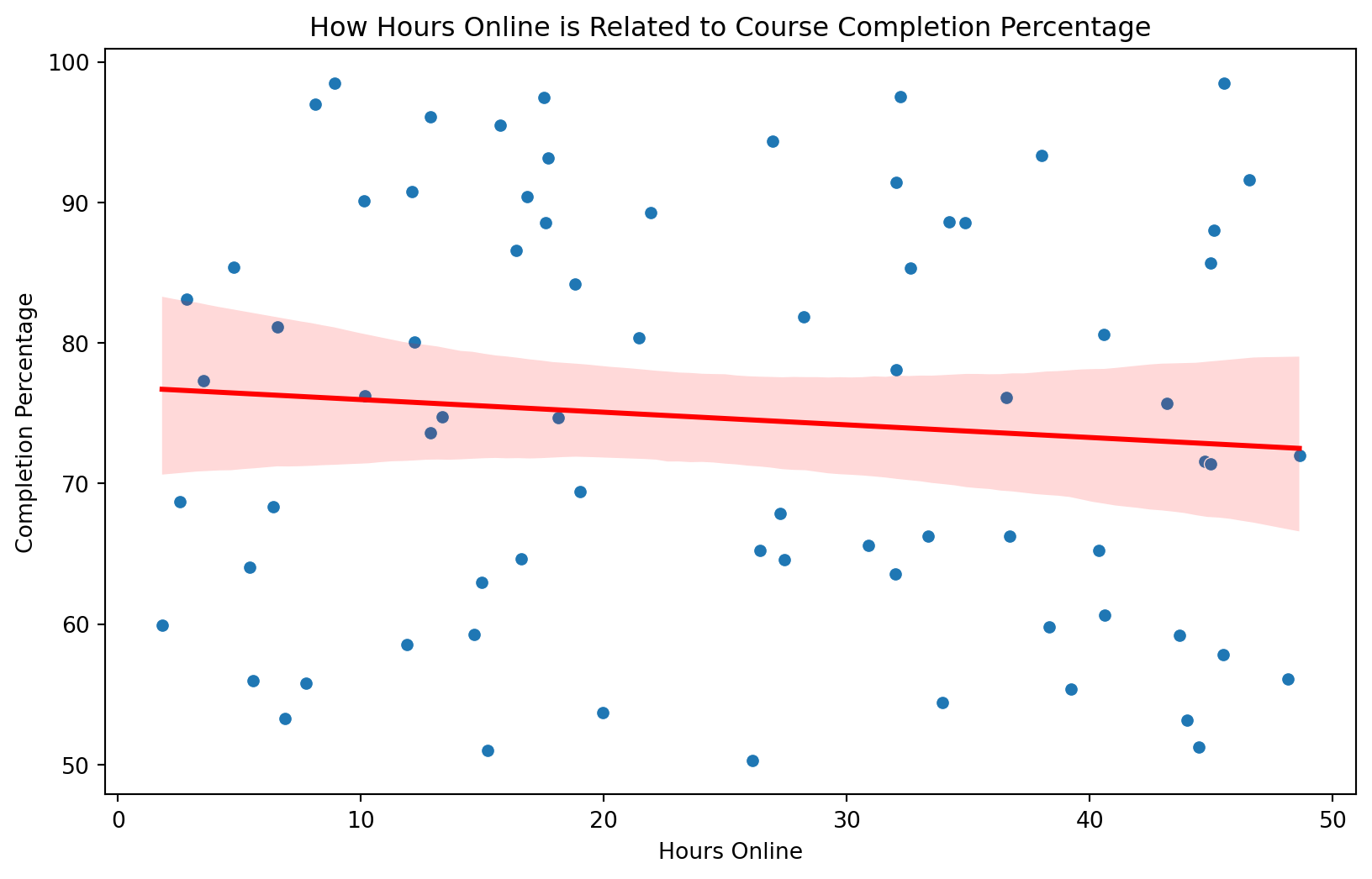 # Step 1: Drop rows with missing valuesdata_cleaned = selected_data.dropna()# Step 2: Define independent and dependent variablesX = data_cleaned[['hours_online']] # Independent variabley = data_cleaned['completion_percentage'] # Dependent variable# Step 3: Add a constant to the model (for the intercept)X = sm.add_constant(X)# Step 4: Fit the modelmodel = sm.OLS(y, X).fit()# Step 5: Output the summary of the modelprint(model.summary())