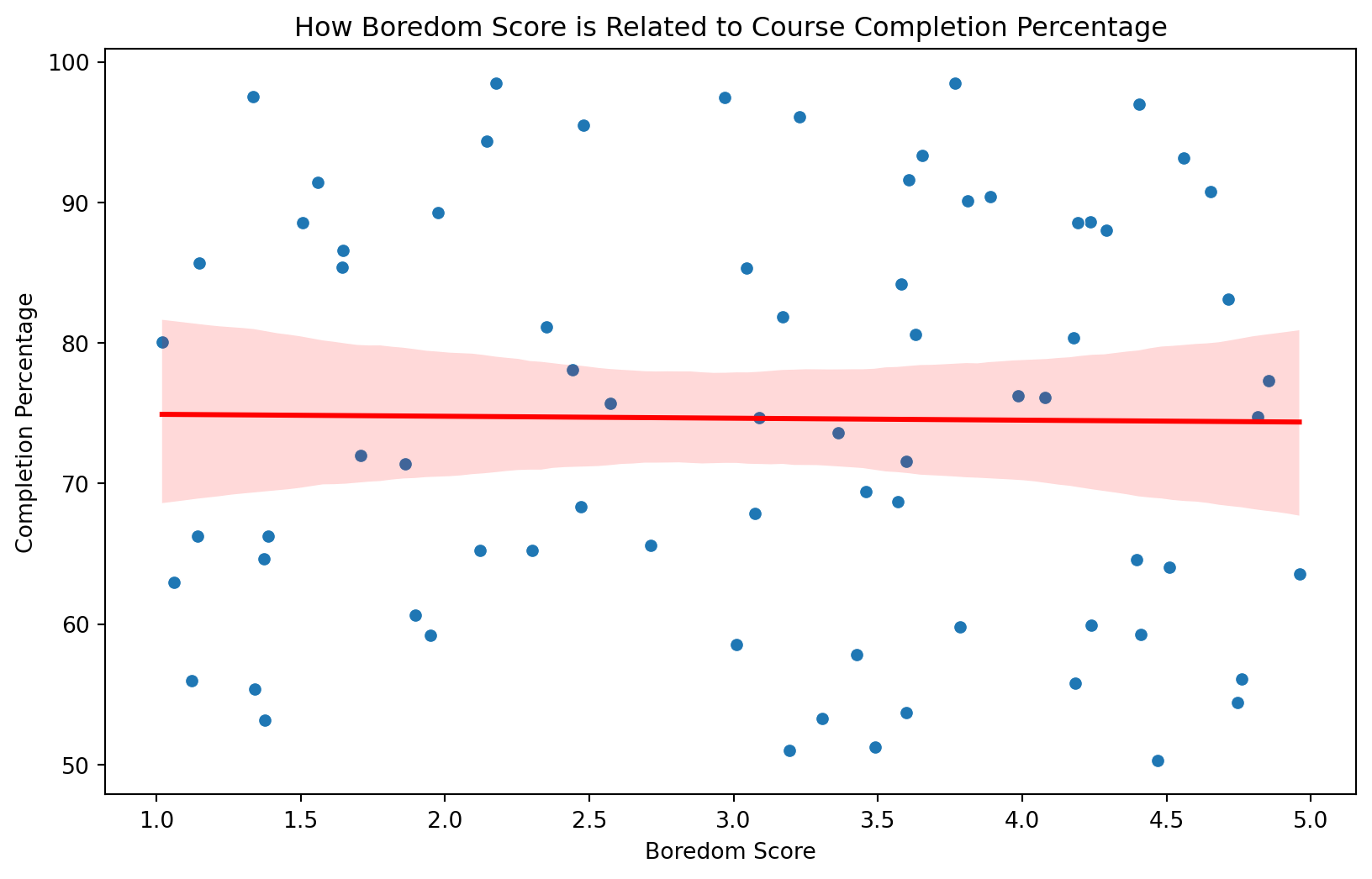 Create a linear regression model with hours_online and boredom_score as the independent variable and completion_percentage as the dependent variable.