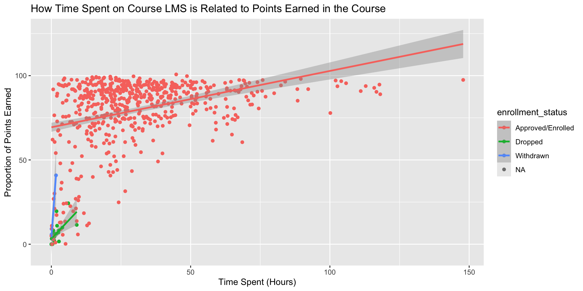data_to_explore %>%ggplot(aes(x = time_spent_hours, y = proportion_earned, color = enrollment_status)) +geom_point() +# add geom_smooth for lmgeom_smooth(method ="lm")+labs(title="How Time Spent on Course LMS is Related to Points Earned in the Course", x="Time Spent (Hours)",y ="Proportion of Points Earned")