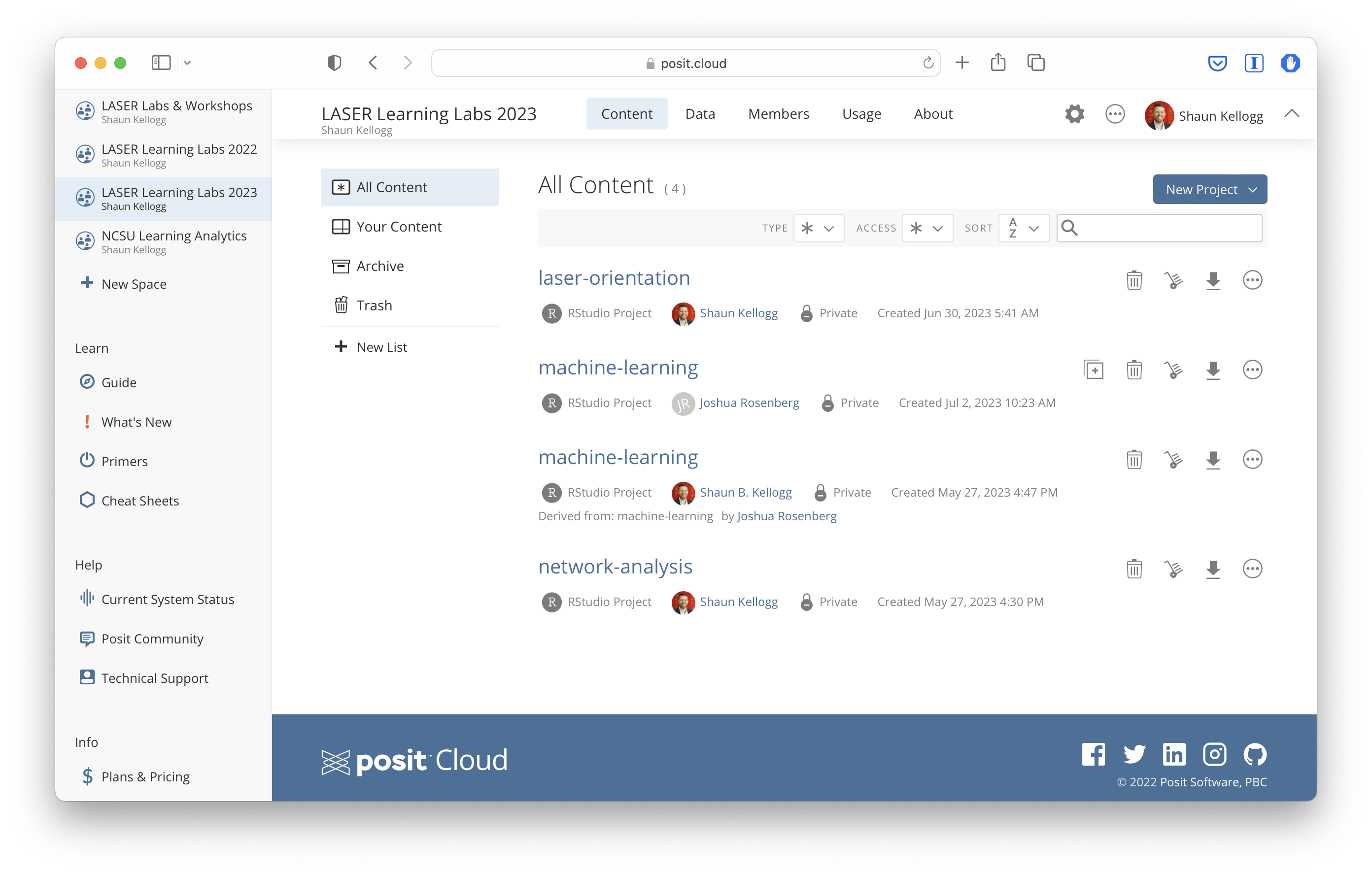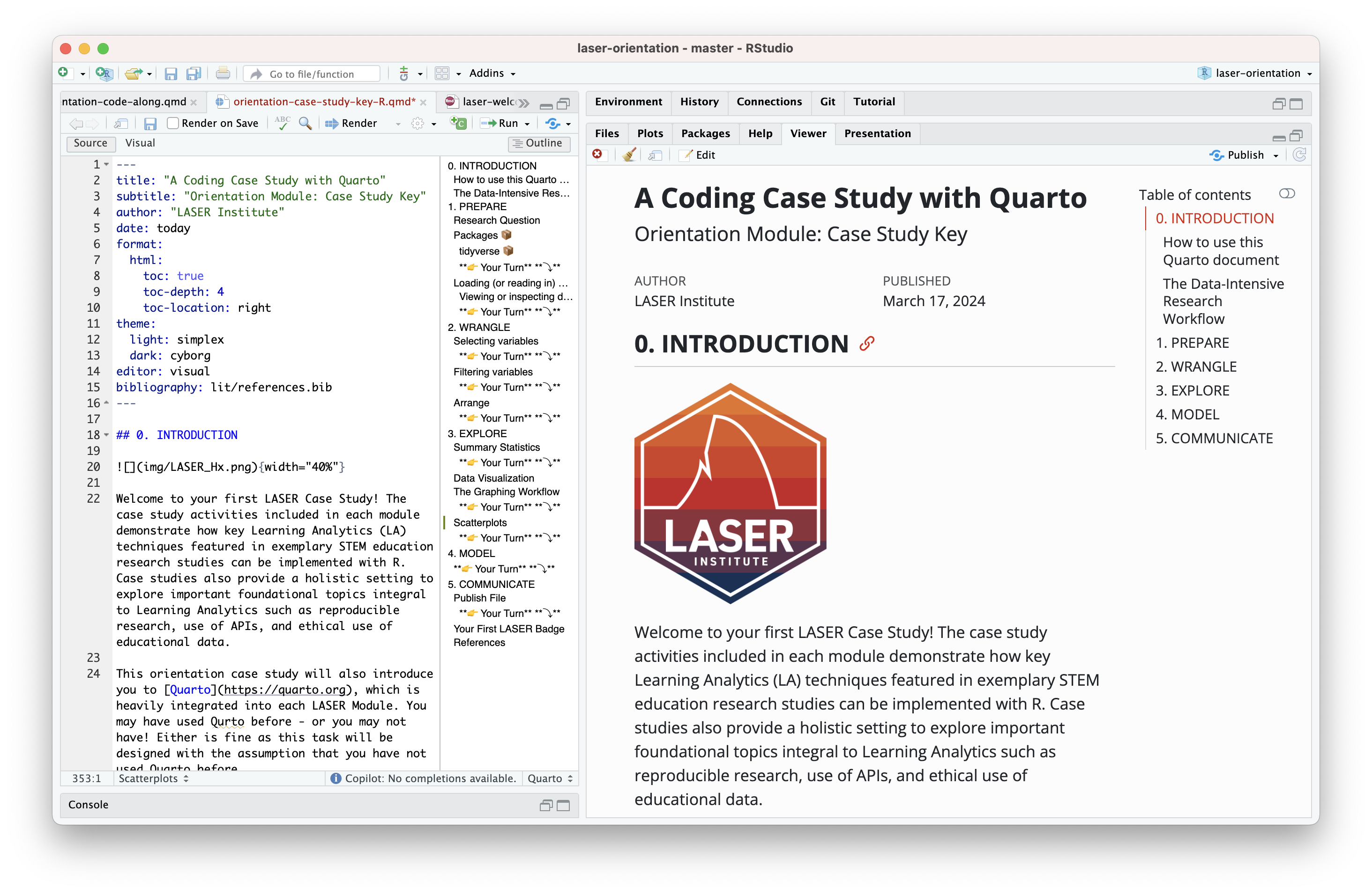 Interactive components for each module (e.g., Case Studies and Code-Alongs) are accessed and complete in our LASER Learners workspace.