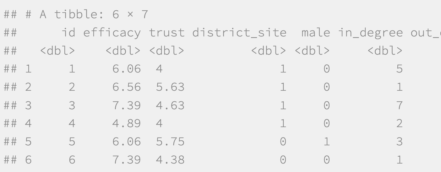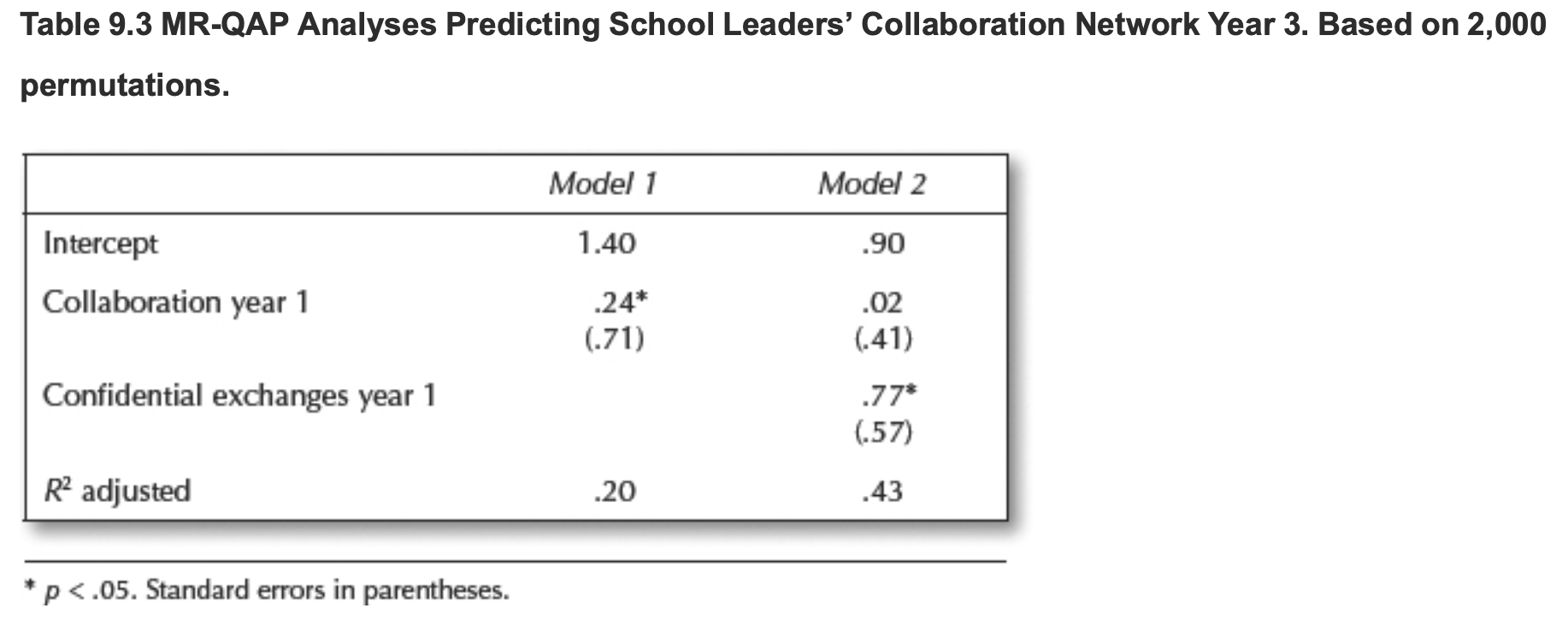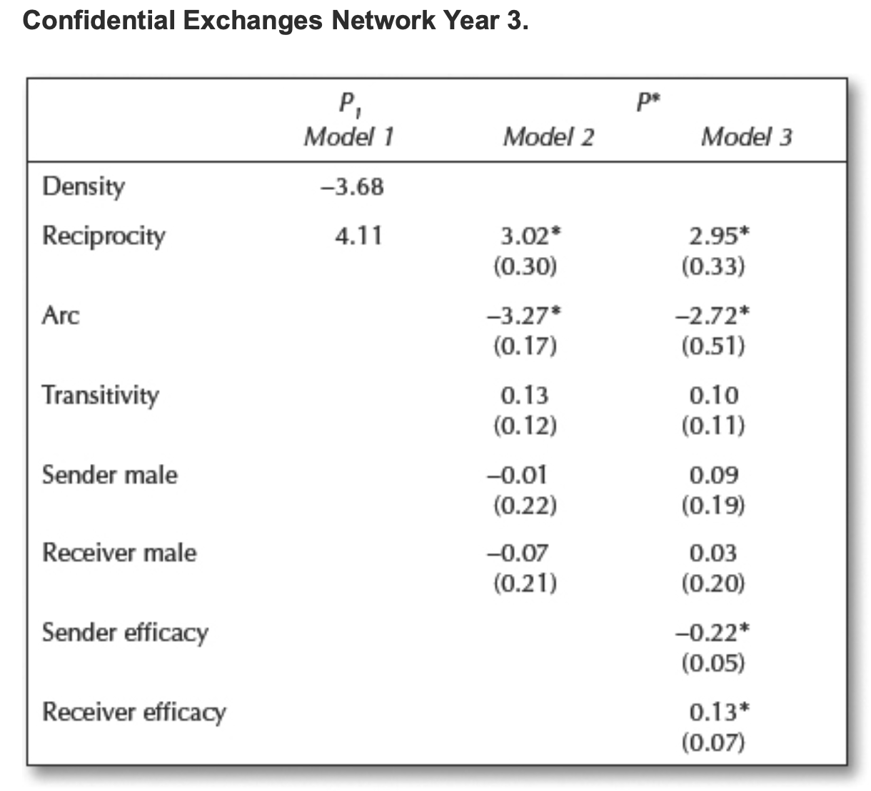 Attributes ->Ties. Does gender or some other individual attribute predicts confidential exchanges between school leaders, or does some previous relation have a stronger effect?